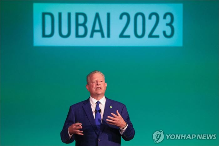 COP28에서 발언하는 앨 고어 전 미국 부통령 (두바이 AFP=연합뉴스) 3일(현지시간) 앨 고어 전 미국 부통령이 아랍에미리트(UAE) 두바이에서 열린 제28차 유엔기후변화협약 당사국총회(COP28)에서 발언하고 있다. 2023.12.3