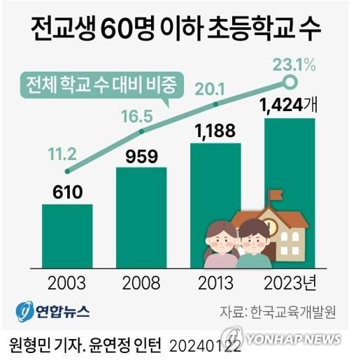 전교생이 60명이 안 되는 전국 초등학교는 20년 전인 2003년 전체 5천463개교 중 11.2%인 610개교였지만, 지난해에는 6천175개교 중 23.1%인 1천424개교로 늘었다.