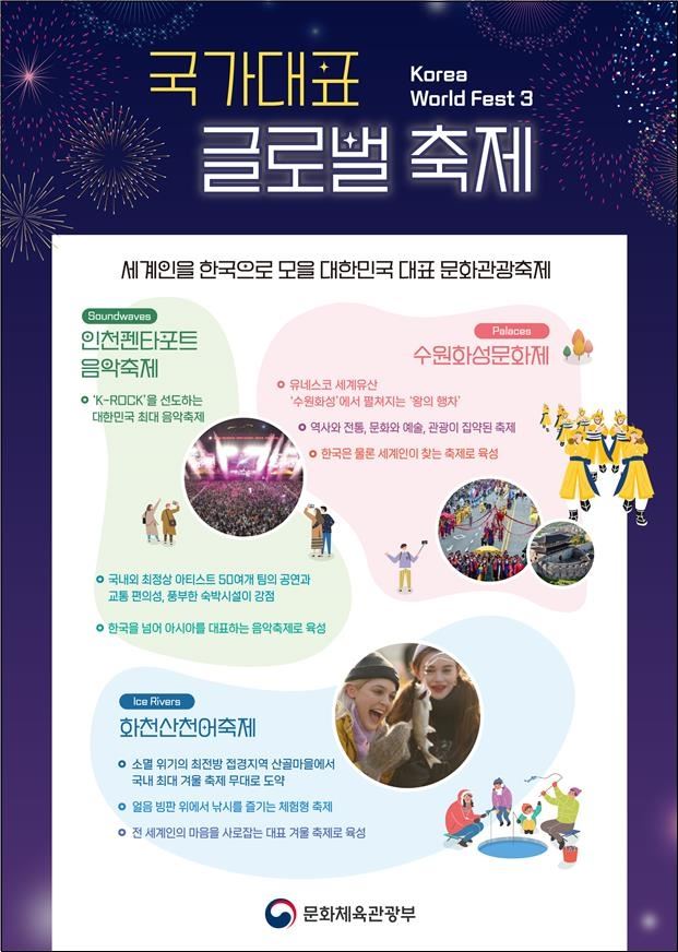 문화체육관광부와 한국관광공사는 글로벌 축제 육성 지원사업 공모를 통해 인천 펜타포트음악축제, 수원 화성문화제, 화천 산천어축제 등 3개 축제를 선정했다고 14일 밝혔다.