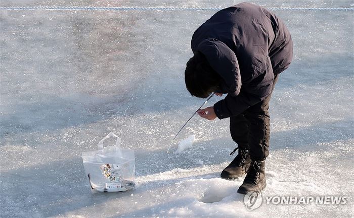 '산천어와 한판승부'. 2024 화천산천어축제 폐막일을 맞은 28일 오후 강원 화천군 화천천 축제장내 외국인 낚시터에서 관광객이 산천어 낚시를 즐기고 있다. 2024.1.28