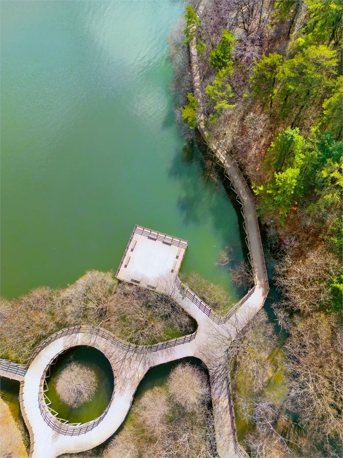 데크로 된 걷기 길이 저수지 가장자리에 자리 잡고 있었고, 많은 시민이 따스해진 봄날을 즐기기 위해 산책에 나선 모습이었다.