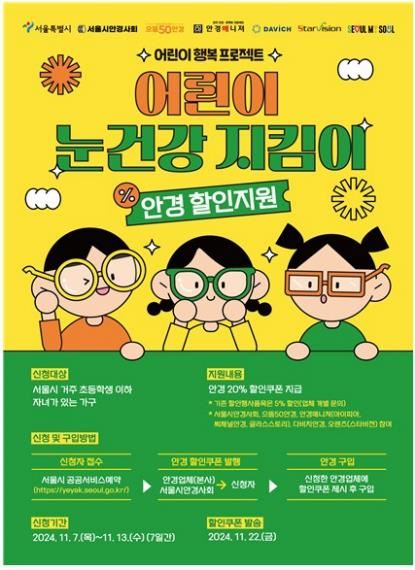 서울시는 어린이의 안경 구입 때 할인 혜택 등을 제공하는 '서울 어린이 눈건강 지킴이 사업' 4차 신청을 받는다고 5일 밝혔다.