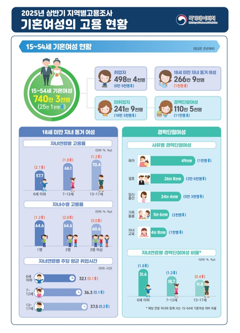 18세 미만 자녀를 둔 기혼여성의 고용률이 60% 중반까지 오르며, 결혼과 출산 이후에도 일을 계속하는 흐름이 확산되고 있다. 과거 육아기 경력단절이 당연시되던 시기와 비교하면 고용 구조에서 뚜렷한 변화가 일어나고 있는 셈이다. 다만 출산과 육아가 집중되는 시기에는 여전히 단절 위험이 존재해 정책적 보완이 필요하다는 지