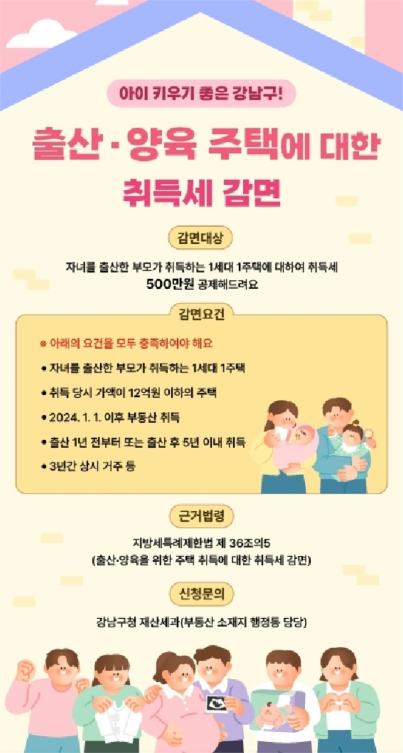 강남구(구청장 조성명)가 출산·양육 가정을 위한 주택 취득세 감면 제도가 구민에게 빠짐없이 안내되도록 제도적 기반을 정비했다. 구는 서울시 자치구 가운데 처음으로 출산서비스 통합처리 신청서 서식을 개정해 출산신고 단계에서부터 주택 취득세 감면 항목을 명시하도록 했다. 이를 통해 구민이 출산신고를 하면서 동시에 세제 혜택