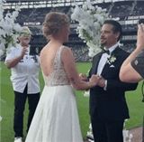 "야구장 그라운드서 펼쳐진 1분 결혼식"