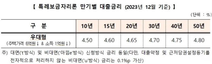 이에 따라 주택가격 6억원·부부 합산 연 소득 1억원 이하 대상의 우대형 금리는 연 4.50%(10년)∼4.80%(50년)로 유지된다.