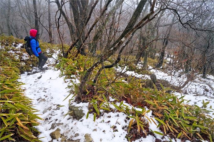 흩어졌다 모이기를 반복하는 안개와 두껍게 쌓인 눈으로 인해 길을 분간하기 어려워 발길을 되돌릴 수밖에 없었지만, 함박등에 오르는 것만도 영축산의 장엄한 멋을 실감하기에 부족함이 없었다.