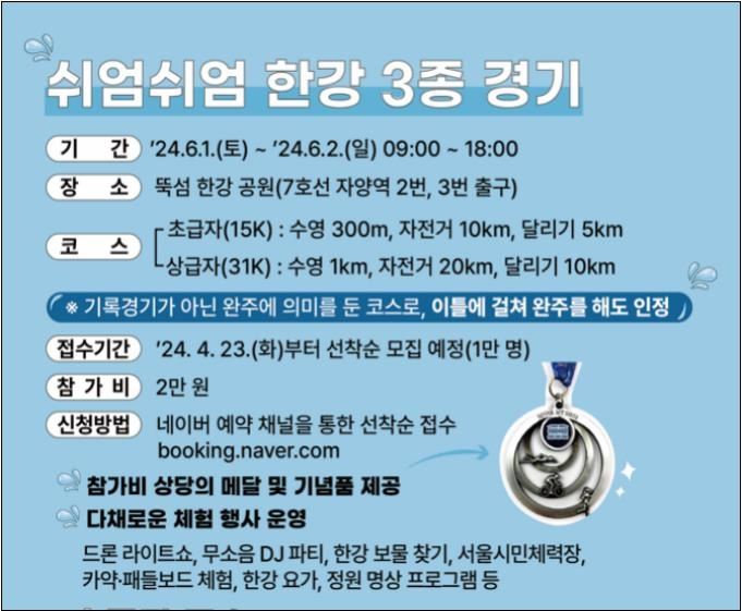 코스는 시민 누구나 참여할 수 있는 '쉬엄쉬엄 초급자'(15K) 코스와 철인 3종 동호인·수영 유경험자가 참가하는 '쉬엄쉬엄 상급자(31K)' 코스 2종이다.