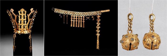 '금관과 금방울, 어린 영혼과 함께하다' 주요 전시품 경남 합천 합천박물관과 경북 고령 대가야박물관에서 각각 6월과 9월에 전시하는 유물. 왼쪽부터 보물 '금령총 금관'과 '경주 금령총 출토 금제 허리띠', 금령총 출토 금방울 [국립중앙박물관 제공. 재판매 및 DB 금지]