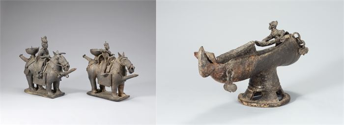 '기마인물형토기와 상형 토기 이야기' 주요 전시품 경북 상주 상주박물관과 전남 해남 공룡박물관에서 열릴 선보일 유물. 왼쪽부터 국보 '도기 기마인물형 명기', 금령총 출토 배 모양 토기 [국립중앙박물관 제공. 재판매 및 DB 금지]