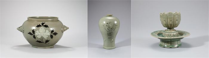 '도자기에 핀 꽃, 상감청자' 주요 전시품 전남 강진 고려청자박물관과 경남 함안 함안박물관이 각각 6월과 9월에 선보일 유물. 왼쪽부터 국보 '청자 상감모란문 항아리', 청자 상감물가풍경무늬 매병, 청자 상감국화무늬 잔과 잔받침 [국립중앙박물관 제공. 재판매 및 DB 금지]