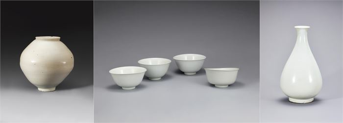 '순백의 아름다움에 빠지다, 조선백자' 주요 전시품 전북 남원 김병종미술관과 강원 양구 백자박물관에서 각각 전시할 유물. 왼쪽부터 백자 달항아리, 국보 '백자 천·지·현·황 명 발', 백자 병 [국립중앙박물관 제공. 재판매 및 DB 금지]