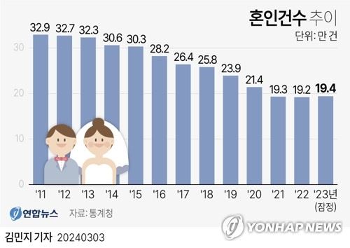 [그래픽] 혼인건수 추이 (서울=연합뉴스) 김민지 기자 = 3일 통계청의 '2023년 12월 인구동향'과 국가통계포털(KOSIS)을 보면 지난해 혼인 건수(잠정치)는 19만3천673건으로 10년 전인 2013년(32만2천807건)보다 40.0% 감소했다.