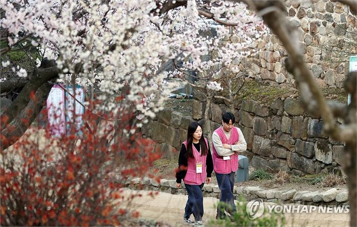 꽃길 데이트…산책하는 남녀 템플스테이 참가자 [연합뉴스 자료사진]