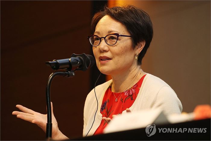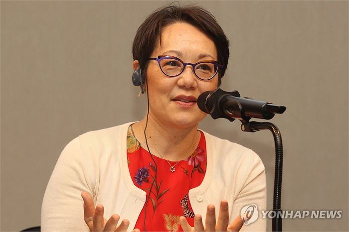 발언하는 앤젤라 워닉 북달 랍비 (서울=연합뉴스) 강민지 기자 = 앤젤라 워닉 북달 랍비가 18일 오전 서울 영등포구 콘래드호텔에서 열린 '앤젤라 워닉 북달 랍비와 이영훈 목사 초청 기자회견'에서 발언을 하고 있다. 2024.6.18 mjkang@yna.co.kr
