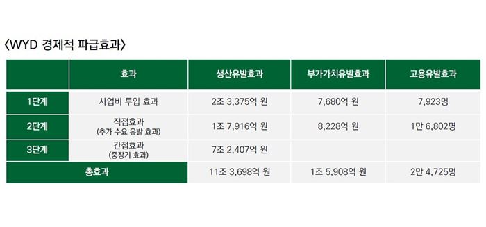 연구팀은 생산·소득·고용·부가가치세·간접세 유발 등 사업비 투입에 따른 경제적 효과 외에 국내외 관광객 증가, 기업·단체의 후원금 및 행사 관련 투자 증가, 정부 부처의 추가 예산 투입 등의 2단계 효과가 있을 것으로 내다봤다.
