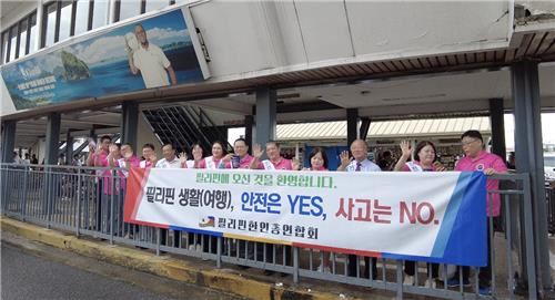 '필리핀 여행 안전 캠페인' 진행 필리핀한인총연합회 (서울=연합뉴스) 필리핀 내 9개 지역 한인회 등을 총괄하는 필리핀한인총연합회가 지난달 19일 마닐라 니노이 아키노 국제공항에서 한국에서 오는 방문객을 대상으로 '필리핀 여행 안전 캠페인'을 진행했다. [필리핀한인총연합회 제공. 재판매 및 DB 금지]