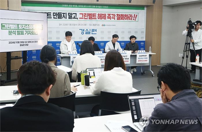 '투기벨트 만들지 말고, 그린벨트 해제 즉각 철회하라' (서울=연합뉴스) 진연수 기자 = 경제정의실천시민연합 도시개혁센터 관계자들이 30일 오후 서울 종로구 경실련에서 그린벨트 토지소유주 현황 분석발표 기자회견을 하고 있다. 2024.10.30 jin90@yna.co.kr