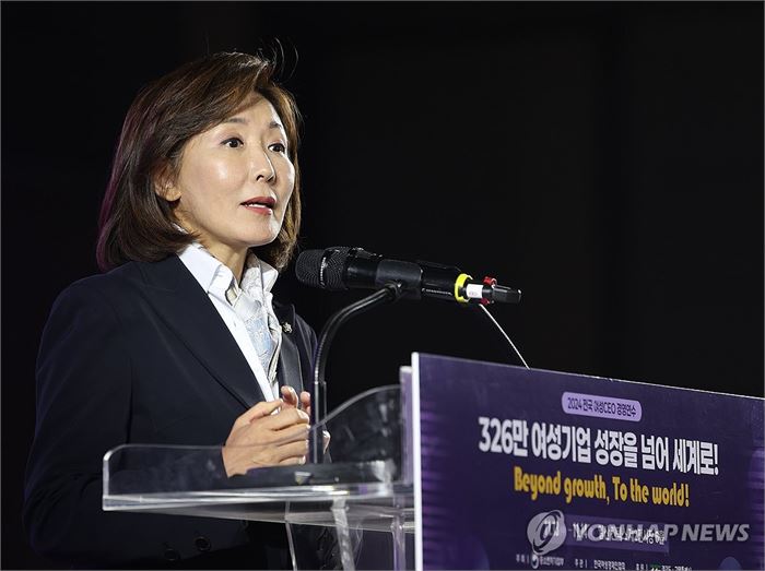 2024 전국 여성 CEO 경영 연수 개회식, 환영사 하는 나경원 의원 (고양=연합뉴스) 김도훈 기자 = 국민의힘 나경원 의원이 13일 오후 경기도 고양시 일산 킨텍스에서 열린 2024 전국 여성 CEO 경영 연수 개회식에 참석해 환영사를 하고 있다 2024.11.13 superdoo82@yna.co.kr