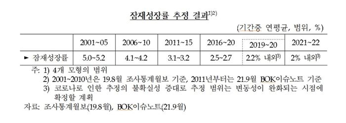 2019∼2020년(2.2%내외)과 2021∼2022년(2%내외) 추정치의 경우 코로나19에 따른 변동성이 완화되는 시점에 다시 확정할 계획으로, 이르면 이달 새로 추정된 잠재성장률이 공개될 가능성이 있다.