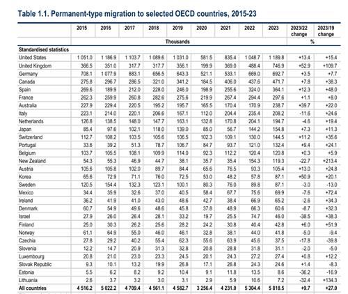 OECD의 '2024년 국제 이민 전망' 보고서를 세부적으로 분석해보면 비교 연도 등에 따라 결과가 달라진다.