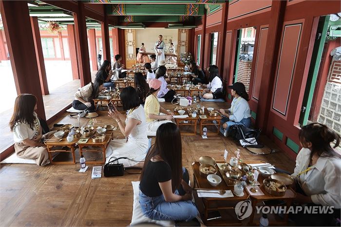궁궐에서 특별한 하루 '한낮의 시식공감' (서울=연합뉴스) 류효림 기자 = 1일 서울 경복궁 소주방에서 열린 '한낮의 시식공감' 다문화가정 결혼 이민자 초청 행사에서 참석자들이 궁중음식을 맛보고 있다. 2024.7.1 ryousanta@yna.co.kr