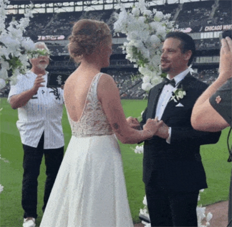 결혼식은 꽃 아치가 설치된 그라운드에서 진행됐다. 주례는 1983년 아메리칸리그 올해의 신인상을 수상한 전 화이트삭스 선수 론 키틀이 맡았다. 그는 ‘Reverend Ron’이라는 글자가 새겨진 유니폼을 입고 등장해 “시카고 화이트삭스가 부여한 권한에 따라, 두 분을 부부로 선언합니다. 이제 키스하셔도 좋습니다”라고 외쳤다. 부부는 환한 미소와 함께 키스를 나눈 뒤, 아기를 높이 들어 올리며 결혼식을 마무리했다.