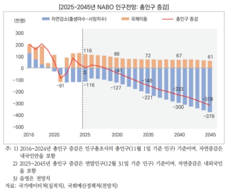 지동하 국회예산정책처장은 “총인구 감소는 생산연령인구 축소에 따른 경제 규모 위축, 학령인구 감소, 병력자원 감소로 이어질 뿐 아니라 지방 소멸과 세대 갈등 등 사회 전반에 연쇄적 영향을 미칠 것”이라며 “출산 중심의 인구 논의에서 벗어나 이민 정책 등 보다 폭넓은 인구 대응 전략에 대한 사회적 논의가 필요하다”고 말했다.